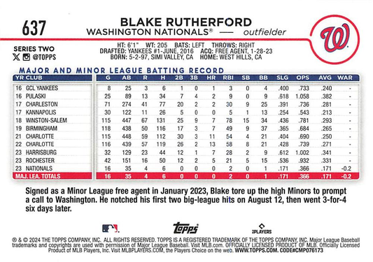 2024 Topps Series 2 Blake Rutherford RC Washington Nationals #637