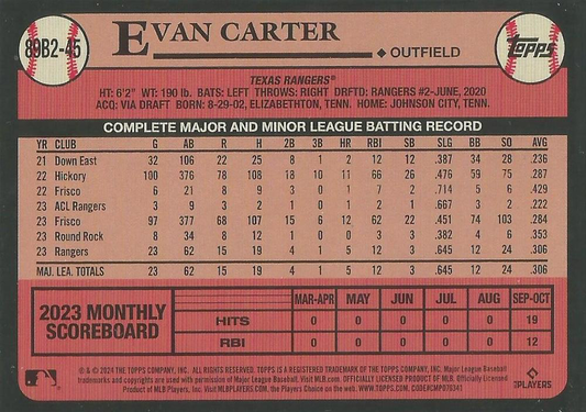 2024 Topps Series 2 1989 35th Anniversary Evan Carter RC Texas Rangers #89B2-45