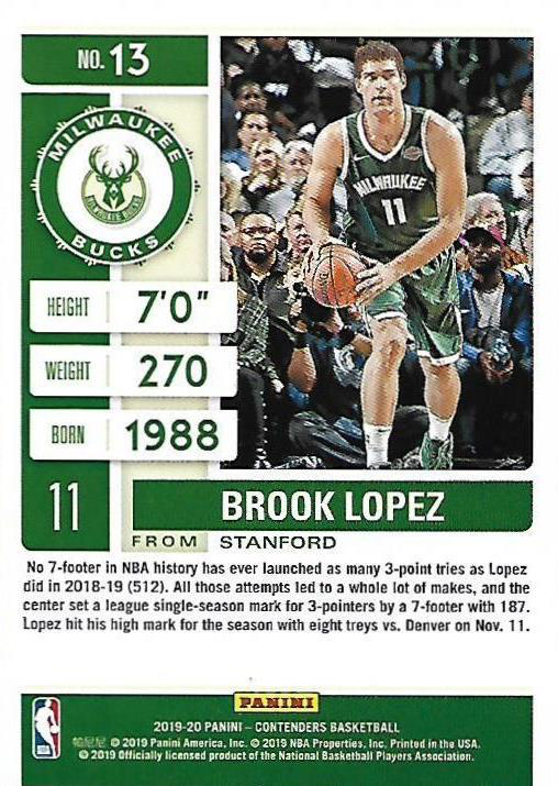 2019 Panini Contenders Brook Lopez #13 Milwaukee Bucks