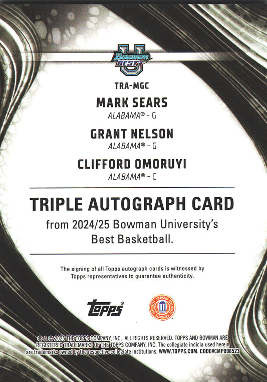 2024 Topps Bowman Best Triple Autograph Red /10 Sears/Nelson/Omoruyi #TRA-MGC Alabama (NCAA)