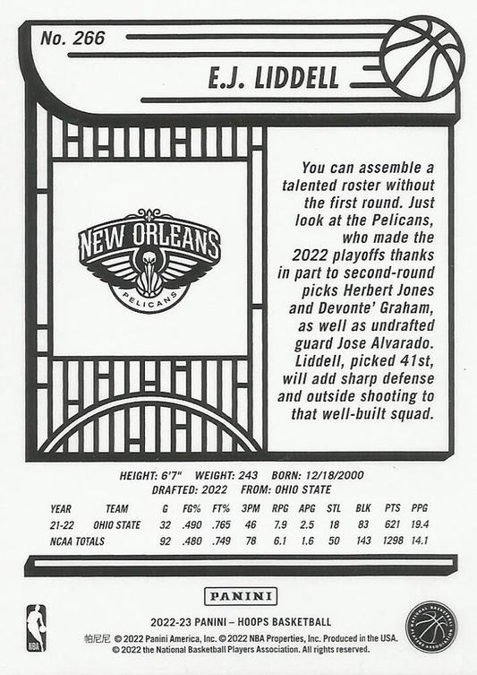 2022 Panini Hoops E.J. Liddell RC #266 New Orleans Pelicans
