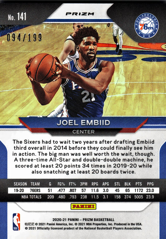 2020 Panini Prizm NBA True Blue Prizm /199 Joel Embiid #141 Philadelphia 76ers
