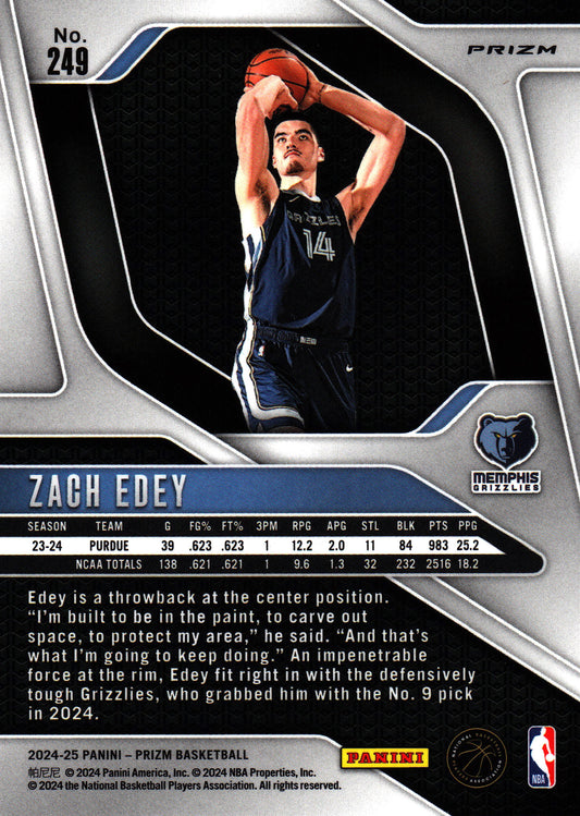 2024 Panini Prizm NBA Silver Zach Edey RC #249 Memphis Grizzlies