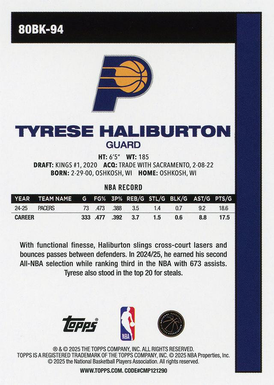 2025 Topps NBA 1980-81 Topps Basketball Tyrese Haliburton 80BK-94 Indiana Pacers