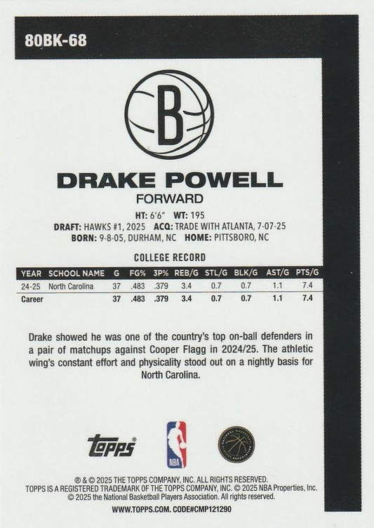 2025 Topps NBA 1980-81 Topps Basketball Drake Powell 80BK-68 Brooklyn Nets