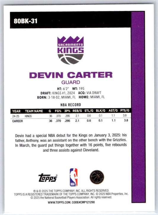 2025 Topps NBA 1980-81 Topps Basketball Devin Carter 80BK-31 Sacramento Kings