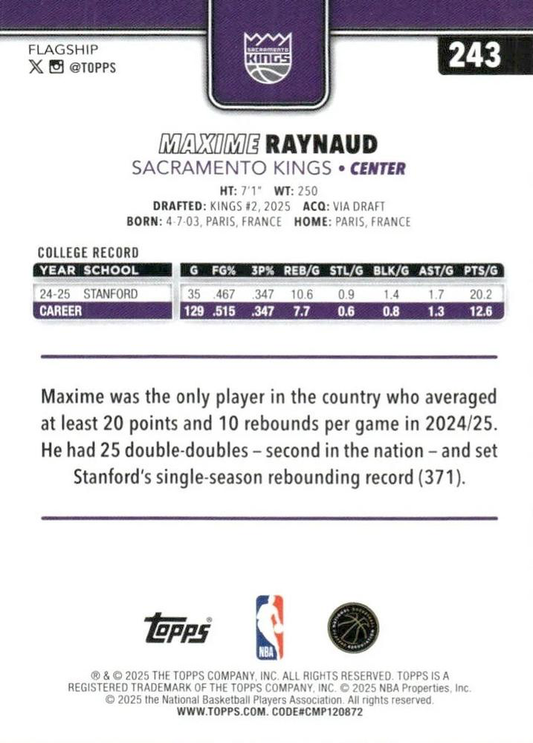 2025 Topps NBA Maxime Raynaud RC #243 Sacramento Kings