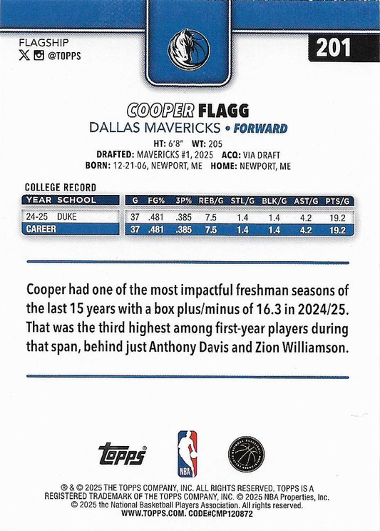 2025 Topps NBA Cooper Flagg RC #201 Dallas Mavericks