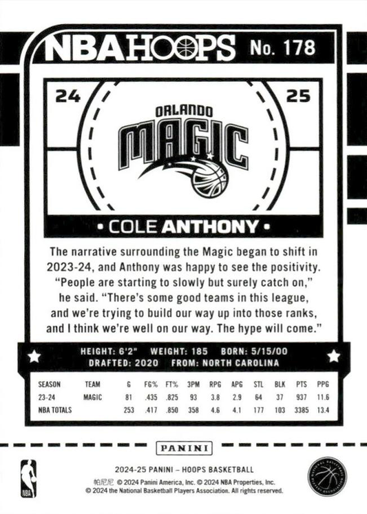 2024 Panini Hoops Cole Anthony #178 Orlando Magic