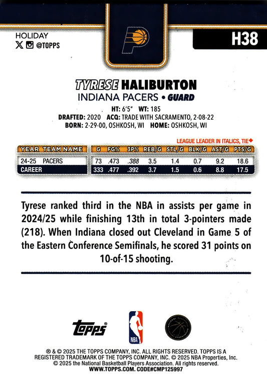 2025 Topps Holiday Blue Metallic Glitter Tyrese Haliburton #H38 Indiana Pacers