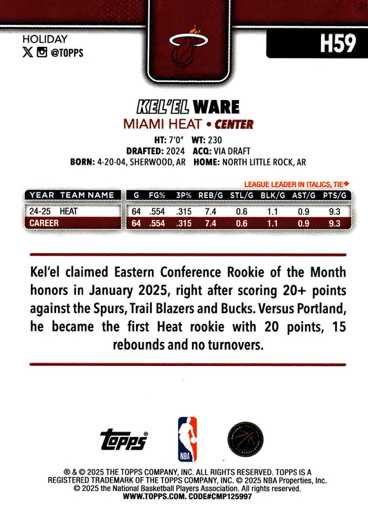 2025 Topps Holiday Light Blue and White Glitter Kel'el Ware #H59 Miami Heat
