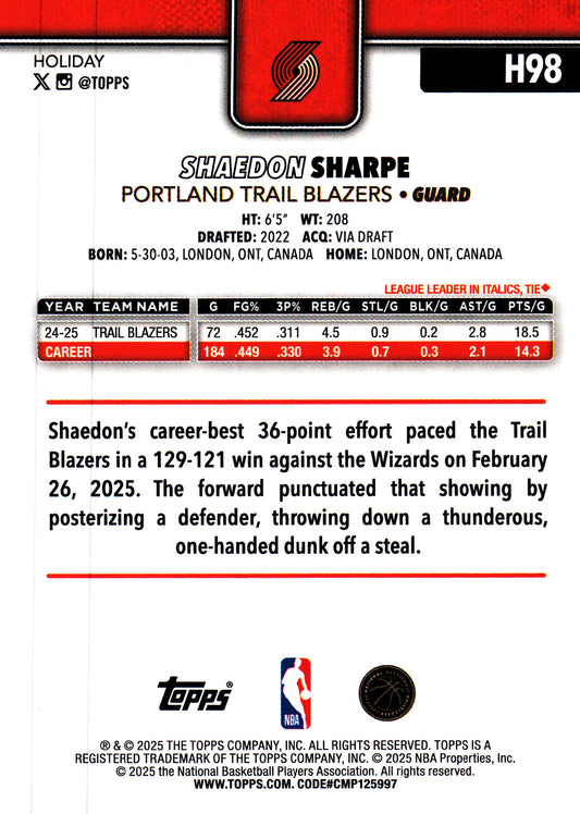 2025 Topps Holiday Glitter Shaedon Sharpe #H98 Portland Trail Blazers