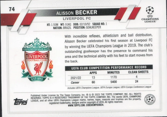 2022 Topps UCC Pink Sparkle Foil Alisson Becker #74 Liverpool