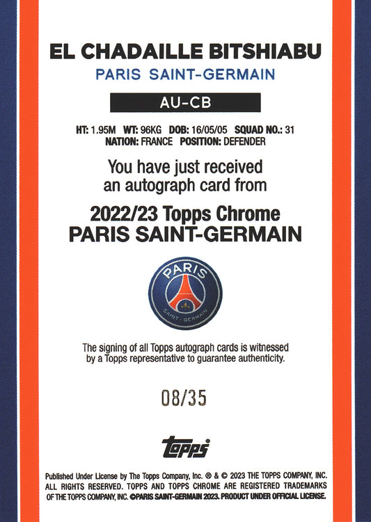 2022 Topps PSG Chrome Set Autograph /35 El Chadaille Bitshiabu RC #AU-CB Paris Saint-Germain