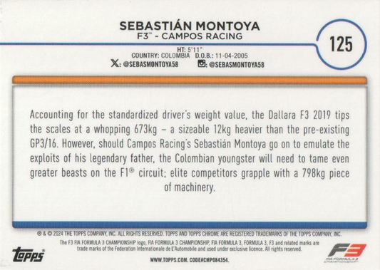 2024 Topps Chrome Formula 1 Sebastian Montoya F3C #125 Campos Racing