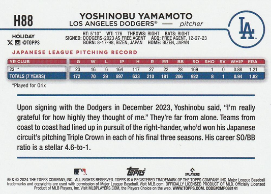 2024 Topps Holiday Yoshinobu Yamamoto RC Los Angeles Dodgers #H88