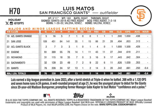2024 Topps Holiday Luis Matos RC San Francisco Giants #H70
