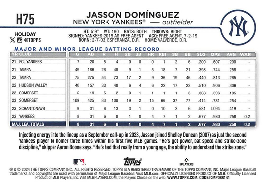 2024 Topps Holiday Jasson Domínguez RC New York Yankees #H75