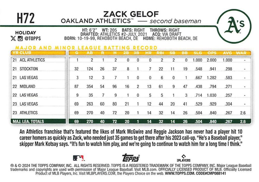 2024 Topps Holiday Zack Gelof RC Oakland Athletics #H72