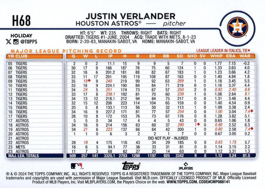 2024 Topps Holiday Justin Verlander Houston Astros #H68