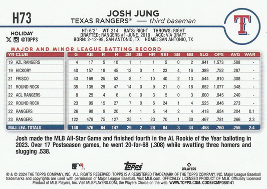 2024 Topps Holiday Josh Jung ASR Texas Rangers #H73