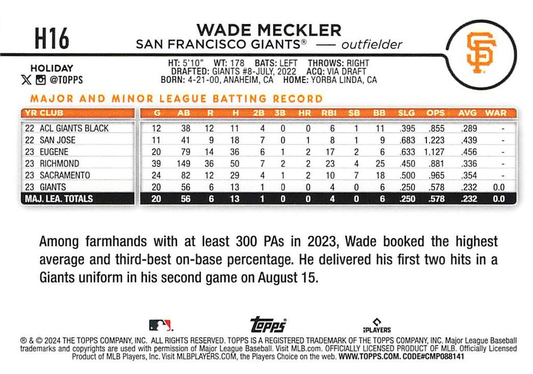 2024 Topps Holiday Wade Meckler RC San Francisco Giants #H16
