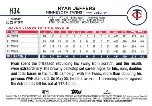 2024 Topps Holiday Ryan Jeffers Minnesota Twins #H34