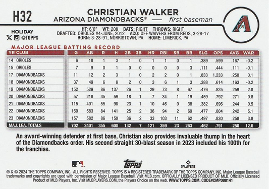 2024 Topps Holiday Christian Walker Arizona Diamondbacks #H32