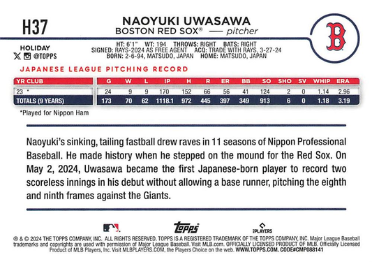 2024 Topps Holiday Naoyuki Uwasawa RC Boston Red Sox #H37