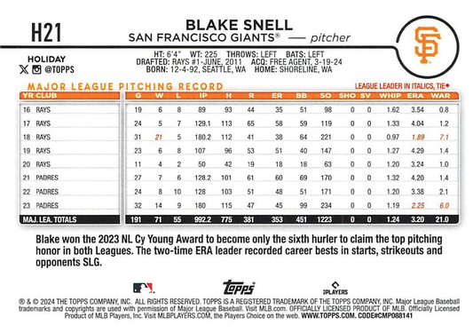 2024 Topps Holiday Blake Snell San Francisco Giants #H21