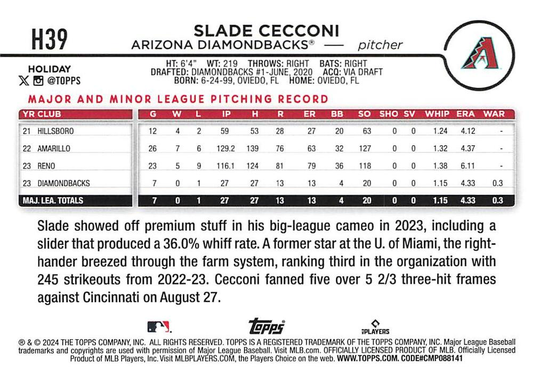 2024 Topps Holiday Slade Cecconi RC Arizona Diamondbacks #H39