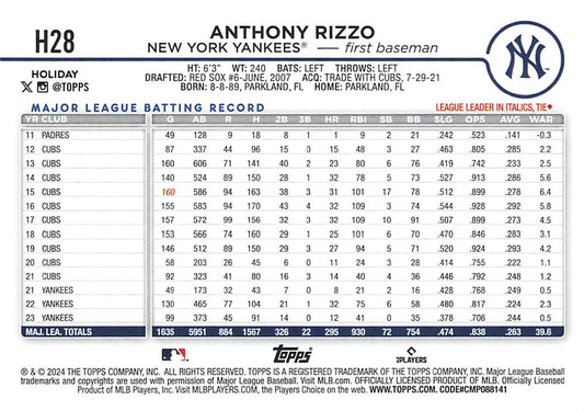 2024 Topps Holiday Anthony Rizzo New York Yankees #H28