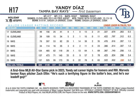 2024 Topps Holiday Yandy Díaz Tampa Bay Rays #H17