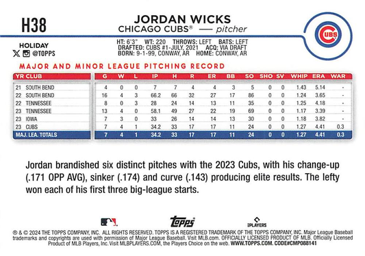 2024 Topps Holiday Jordan Wicks RC Chicago Cubs #H38
