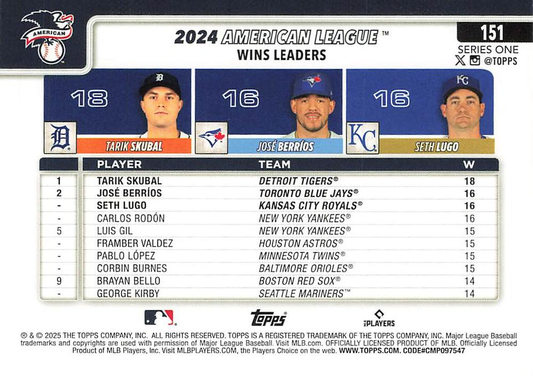2025 Topps Series 1 League Leaders Tarik Skubal / José Berríos / Seth Lugo Tigers / Blue Jays / Royals #151