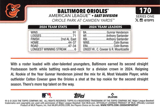 2025 Topps Series 1 Team Card Baltimore Orioles #170