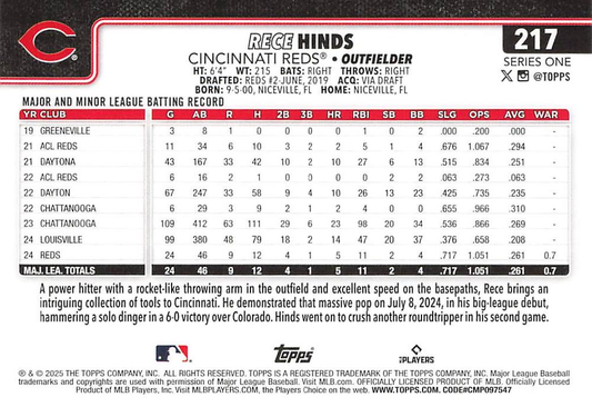 2025 Topps Series 1 Rece Hinds RC Cincinnati Reds #217