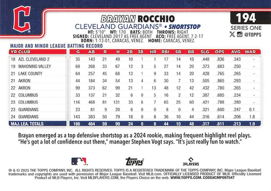 2025 Topps Series 1 Brayan Rocchio Cleveland Guardians #194