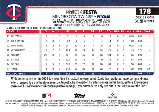 2025 Topps Series 1 David Festa RC Minnesota Twins #178
