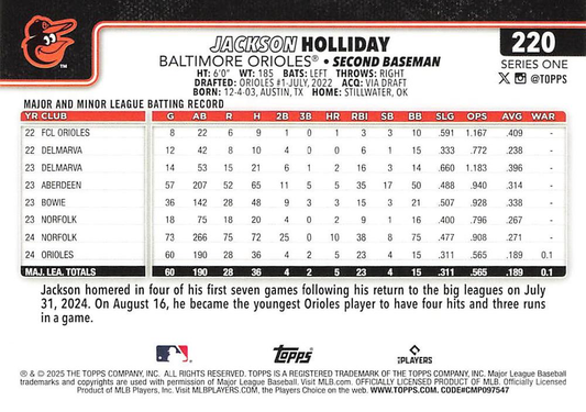 2025 Topps Series 1 Jackson Holliday Future Stars Baltimore Orioles #220