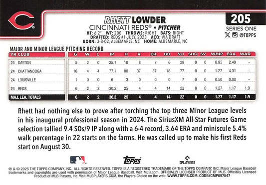 2025 Topps Series 1 Rhett Lowder RC Cincinnati Reds #205