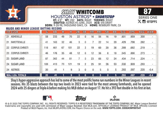 2025 Topps Series 1 Shay Whitcomb RC Houston Astros #87