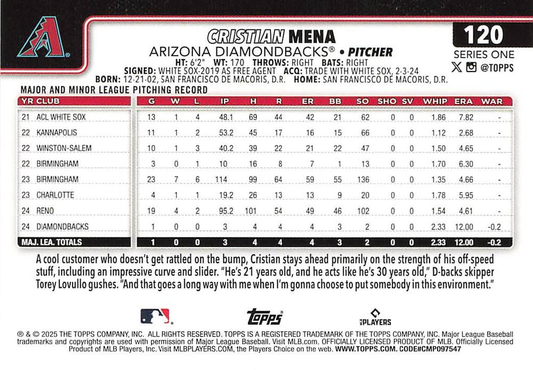 2025 Topps Series 1 Cristian Mena RC Arizona Diamondbacks #120