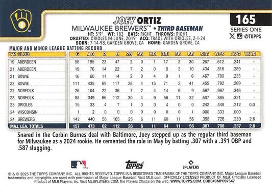 2025 Topps Series 1 Joey Ortiz ASR Milwaukee Brewers #165