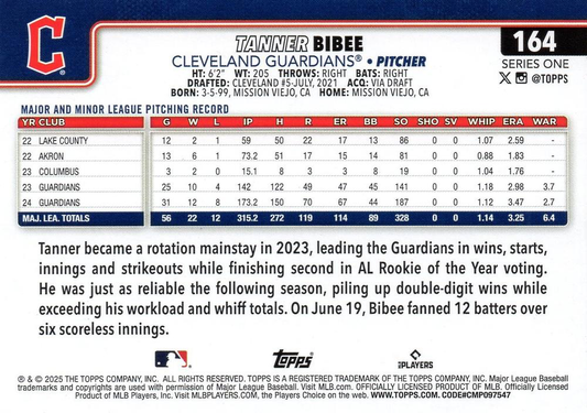2025 Topps Series 1 Tanner Bibee Cleveland Guardians #164