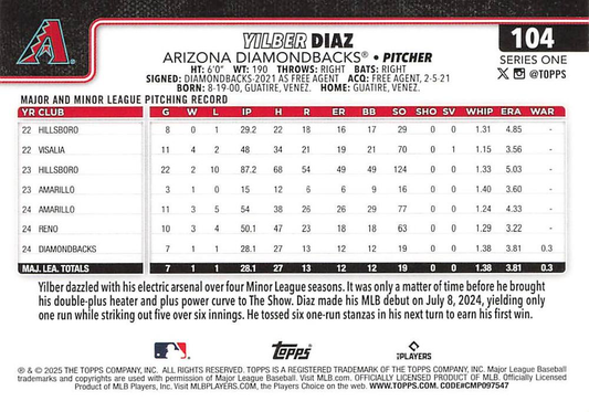 2025 Topps Series 1 Yilber Diaz RC Arizona Diamondbacks #104