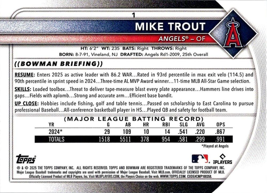 2025 Topps Bowman Mike Trout Los Angeles Angels #1