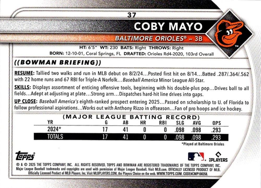 2025 Topps Bowman Coby Mayo RC Baltimore Orioles #37