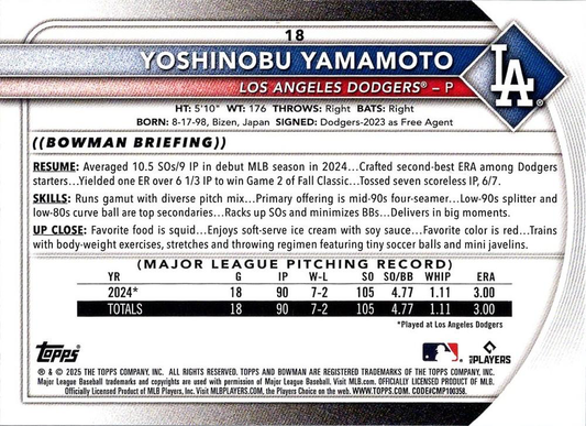 2025 Topps Bowman Yoshinobu Yamamoto Los Angeles Dodgers #18