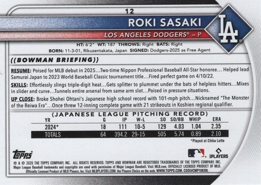 2025 Topps Bowman Roki Sasaki RC Los Angeles Dodgers #12